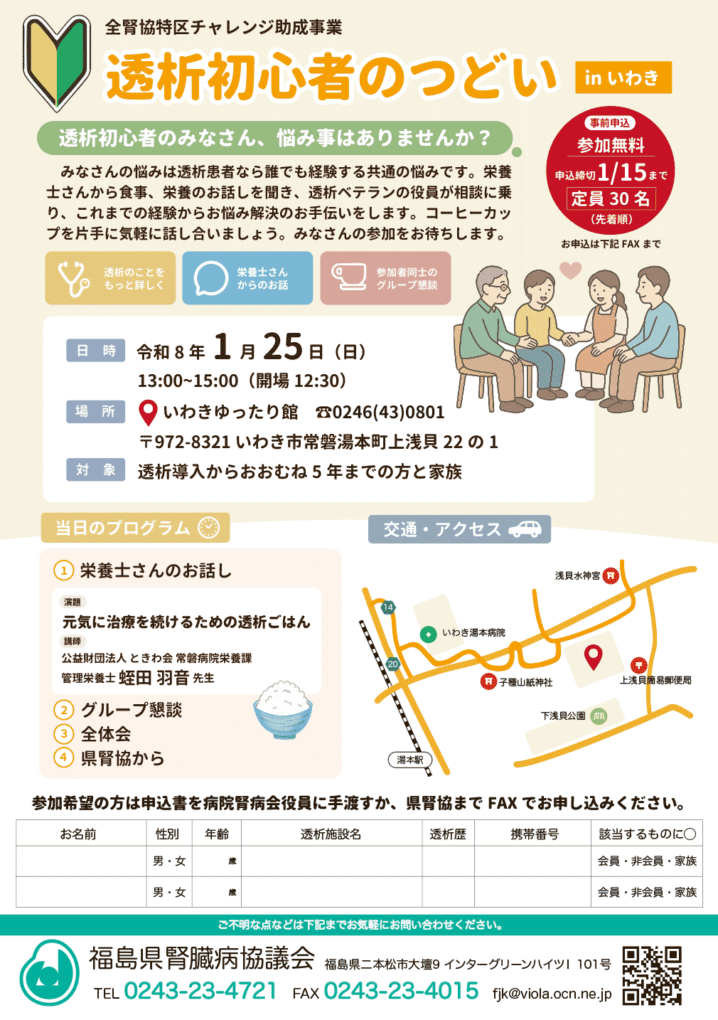 「透析患者初心者のつどい」を令和8年1月25日(日)、いわき市常磐湯本町の「いわきゆったり館」で開きます。