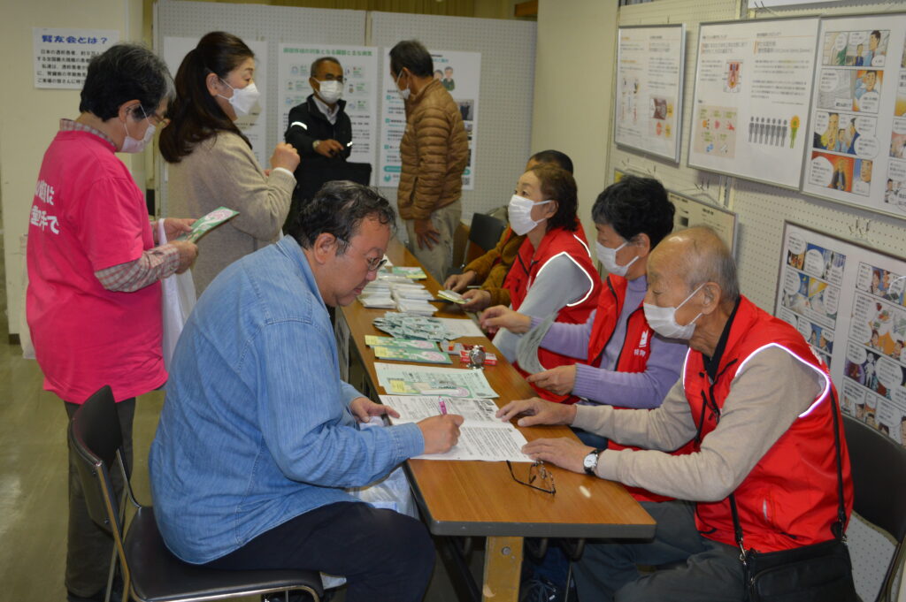 ブースには慢性腎臓病(CKD)や人工透析、臓器移植について分かりやすく解説したパネルが展示されたほか、「国民を腎疾患から守る総合対策」の確立を要望する国会請願の署名活動も行われ、多くの市民が署名していました。