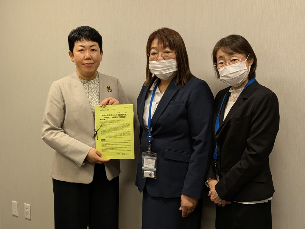 この後、各県ごとに代表が衆院議員、参院議員の事務所を訪れ、「国民を腎疾患から守る総合対策」の早期確立を求める要望書に賛同した約2300筆の署名簿を紹介議員の金子恵美議員(衆院・中道)、岩渕友(参院・共産)両議員は本人に、他は秘書に手渡しました。